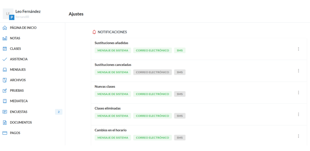 Al elegir la opción Ajustes, podrás decidir qué tipo de notificaciones deseas recibir del sistema. Sin embargo, recuerda que si tu academia no envía notificaciones por SMS y decides desactivar las notificaciones por correo electrónico, podrías perderte información importante.