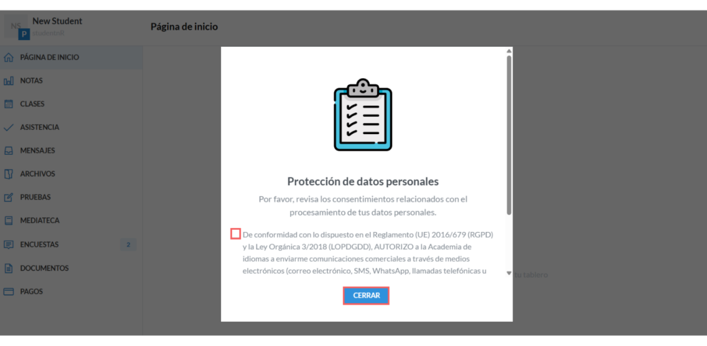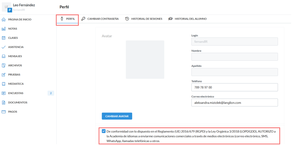 En el siguiente paso podrás editar los consentimientos relacionados con el tratamiento de datos personales. Algunos de ellos pueden estar marcados como obligatorios, mientras que otros solo podrán modificarse contactando con la administración de la academia.