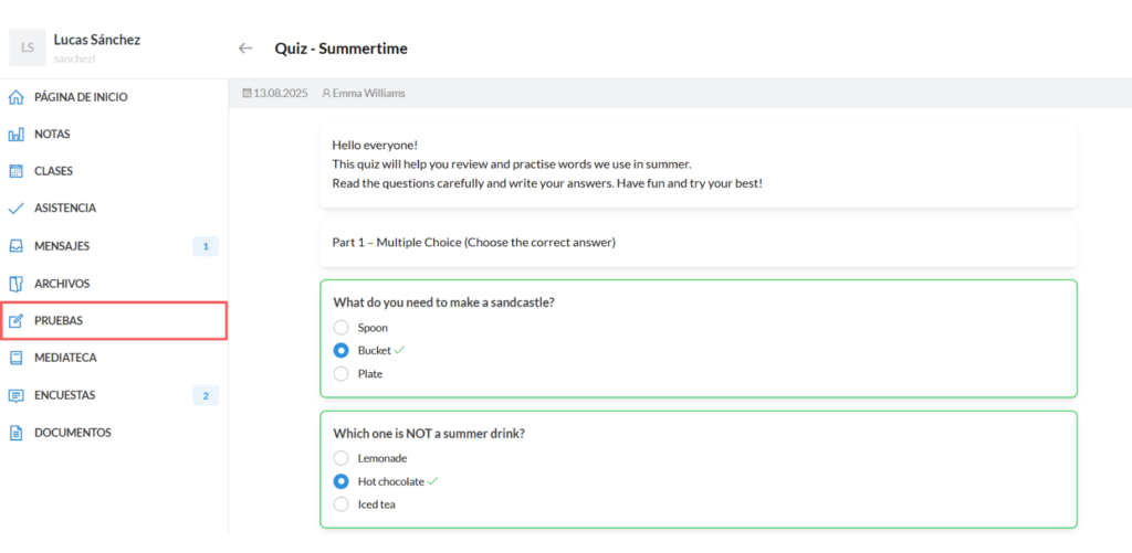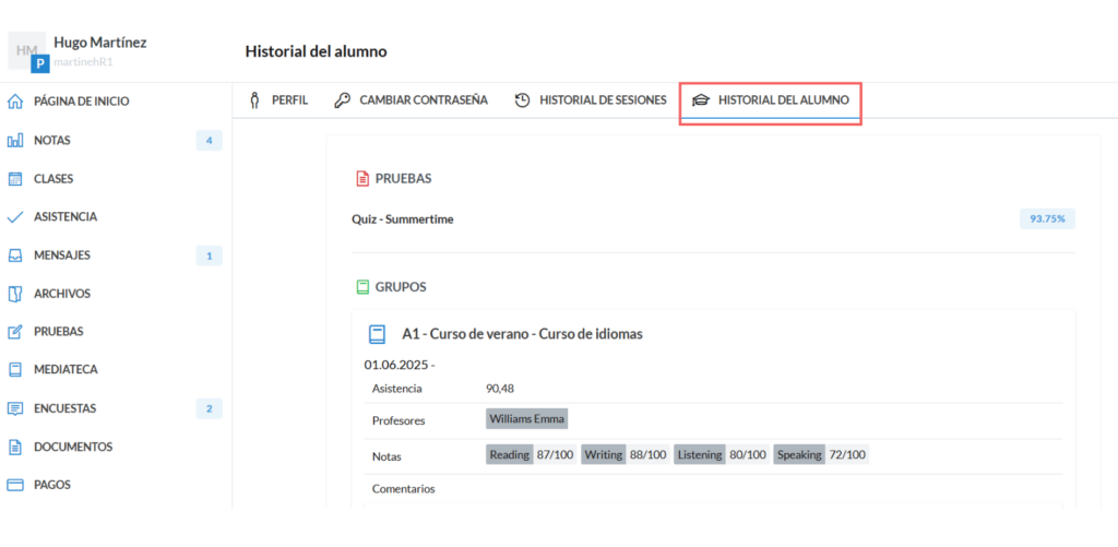- Historial de aprendizaje – aquí podrás consultar la información básica de tu grupo (y también de tus grupos anteriores), como tus notas, observaciones, asistencia y resultados de exámenes en línea.