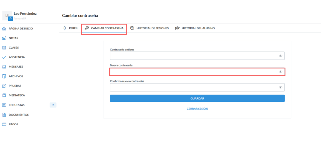 - Cambio de contraseña – desde esta opción podrás modificar tu contraseña actual por una nueva de forma rápida y segura.