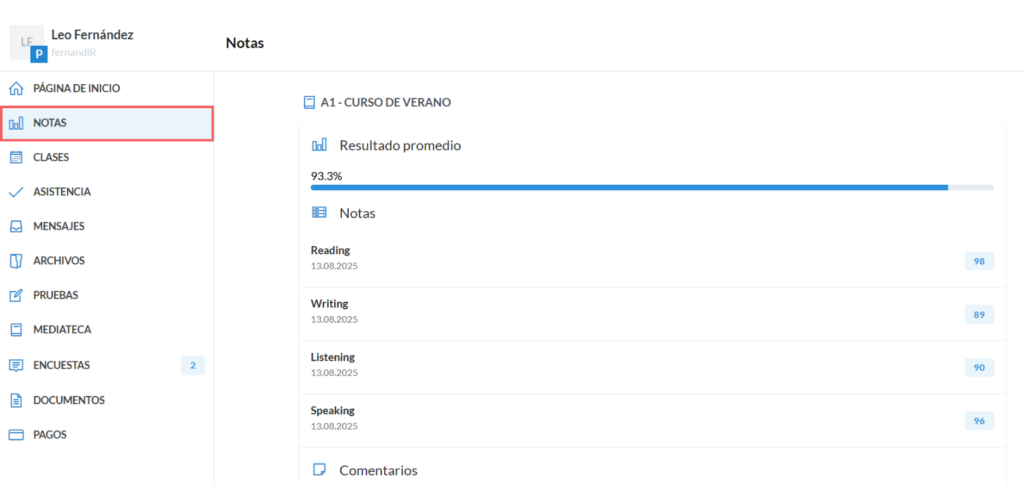 Si quieres comprobar cómo van tus resultados en tu grupo, accede a la pestaña Notas. Allí encontrarás información detallada sobre tu promedio, podrás ver cómo han ido cambiando tus notas a lo largo del tiempo y cómo se comparan tus resultados con los del grupo.