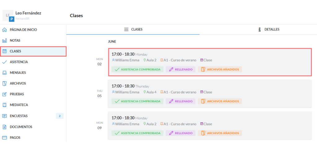 Haz clic en la pestaña Clases para consultar la lista de tus clases y los detalles de tu grupo (la pestaña Detalles incluye un resumen de la información del grupo y el historial del alumno).
