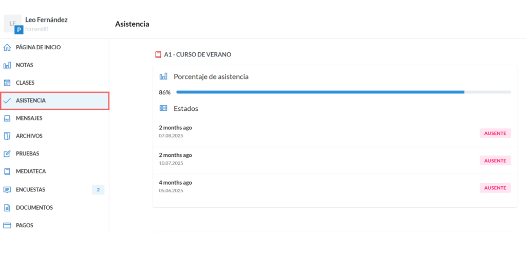 En la siguiente pestaña podrás consultar tu asistencia en los grupos.