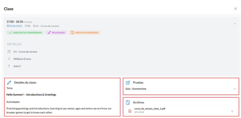 Haz clic en una clase concreta para ver la información detallada: el contenido trabajado o la tarea asignada.