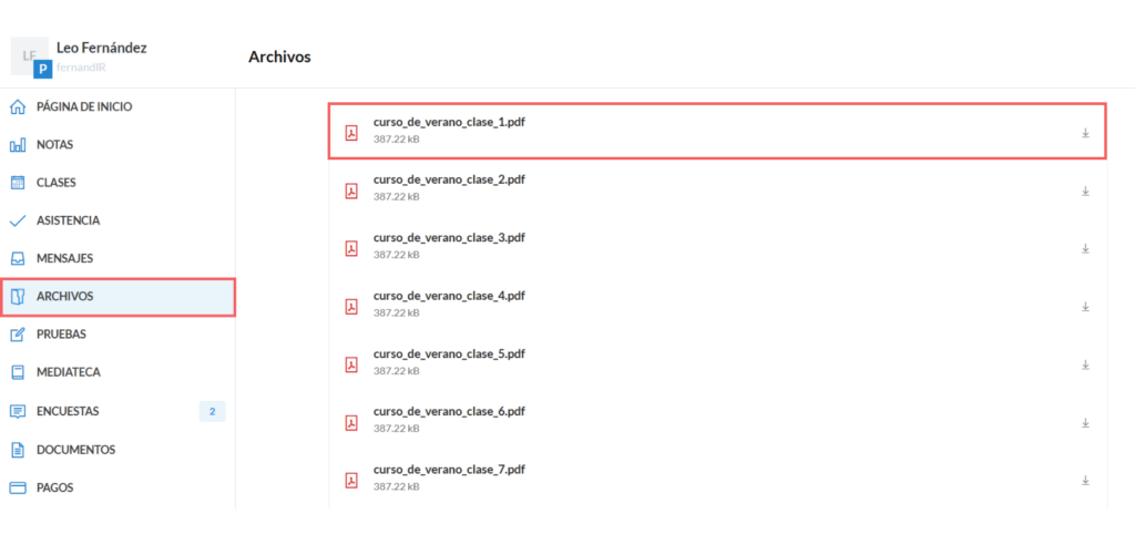 En la pestaña Archivos aparecerán los materiales compartidos por el profesor o por la secretaría de la escuela. Puedes visualizarlos directamente en el panel y descargarlos en tu dispositivo cuando te resulte más cómodo.