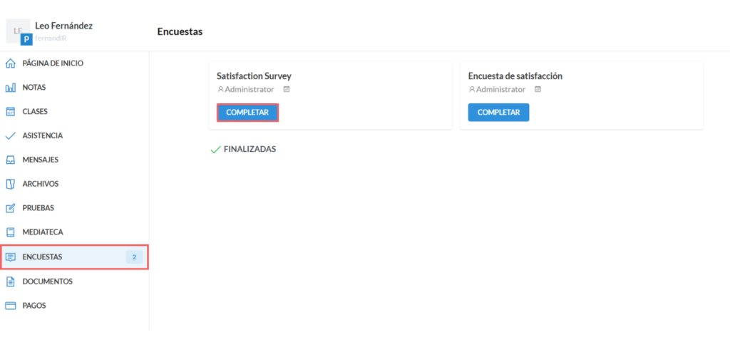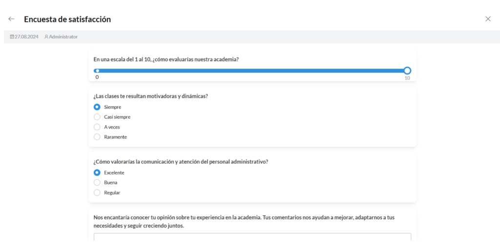 A menudo, las academias quieren conocer tu opinión sobre los cursos, la oferta o medir tu nivel de satisfacción con la colaboración hasta ahora. Las encuestas de satisfacción que se te hayan compartido estarán disponibles en la pestaña Encuestas.