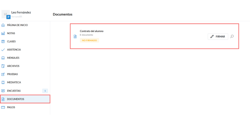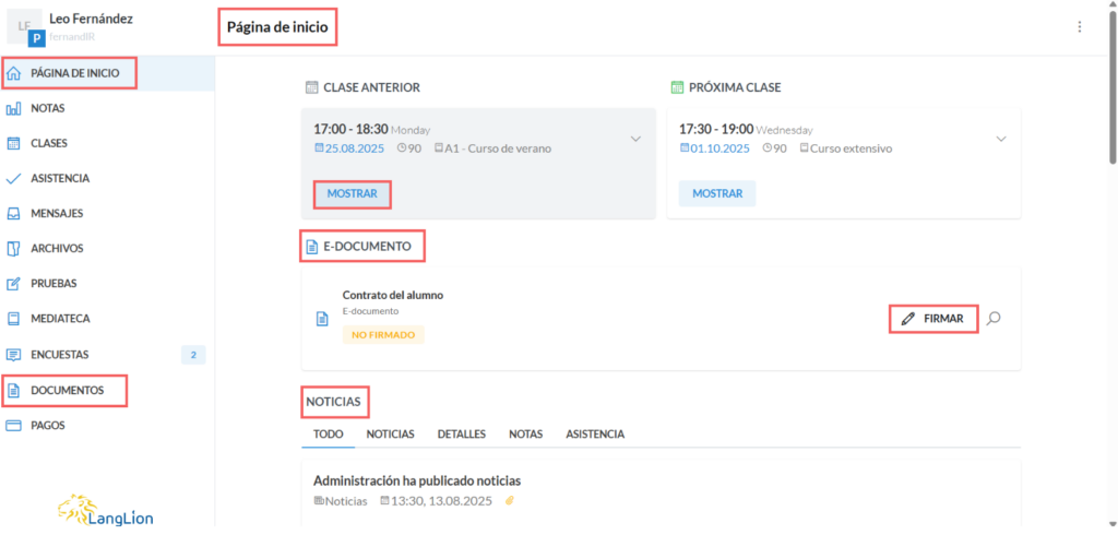Ten en cuenta que la academia puede poner a tu disposición contratos para firmar en línea. Los nuevos e-documentos pendientes de firma se mostrarán encima de la sección de noticas en la Página de inicio. Podrás firmarlos directamente desde allí. Una vez firmados, los e-documentos desaparecerán de la página principal, pero seguirás teniendo acceso a ellos desde la pestaña Documentos.