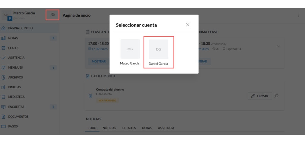 La academia tiene la posibilidad de vincular las cuentas de los hermanos, de modo que, al iniciar sesión como padre o madre, podrás cambiar entre las cuentas de tus hijos.
