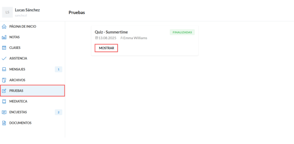 En la pestaña Pruebas encontrarás la lista de pruebas en línea que te haya compartido tu profesor o la secretaría.