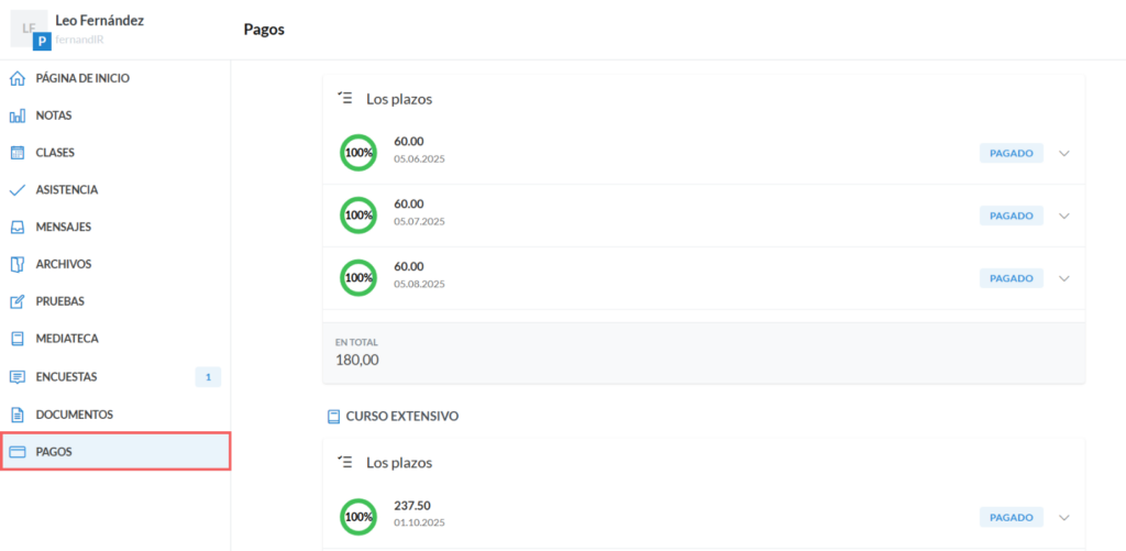 La pestaña Pagos te permite gestionar las cuotas de tu curso: nada más acceder verás tu saldo de pagos y, justo debajo, los detalles de tus transacciones.