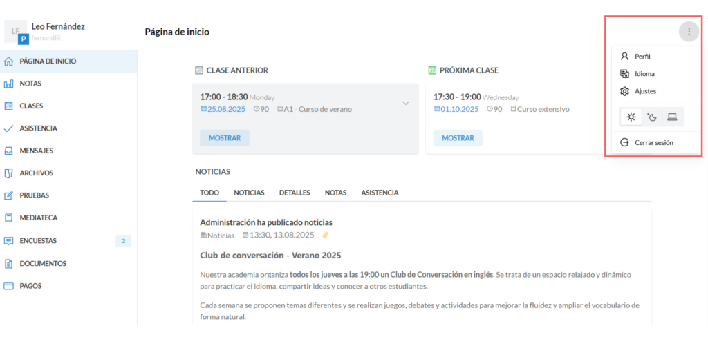 Después de guardar la información serás redirigido a la página de inicio. Aquí podrás ver tus últimas y próximas clases, así como la lista de notificaciones y anuncios de la academia.