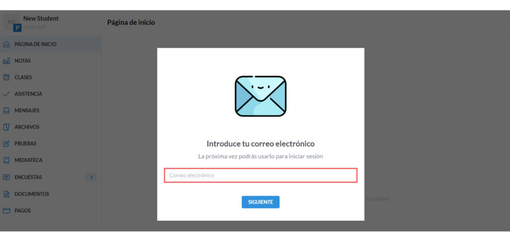 A continuación, puedes añadir (o confirmar, si ya está introducida) tu dirección de correo electrónico. Más adelante podrás utilizarla para iniciar sesión en lugar del usuario que te haya asignado la academia.